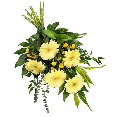 Dekoratørens vakker bårebukett i gult og grønt. (bildet er kun et eksempel på hvilke blomster og farger som buketten kan innehold). Begravelse.